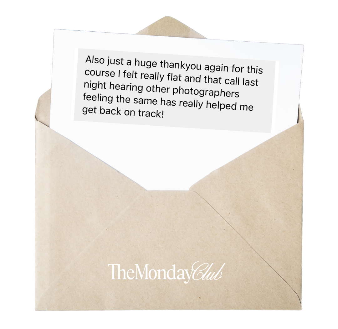 Tired of building your photography business alone? Inside The Monday Social Club, you'll find the support, clarity and accountability you need to actually keep going and grow with confidence. This isn’t just another membership. It’s your photographer group chat. Whether you're stuck in a creative rut, unsure what to post next or just craving people who just get it, this is your space.